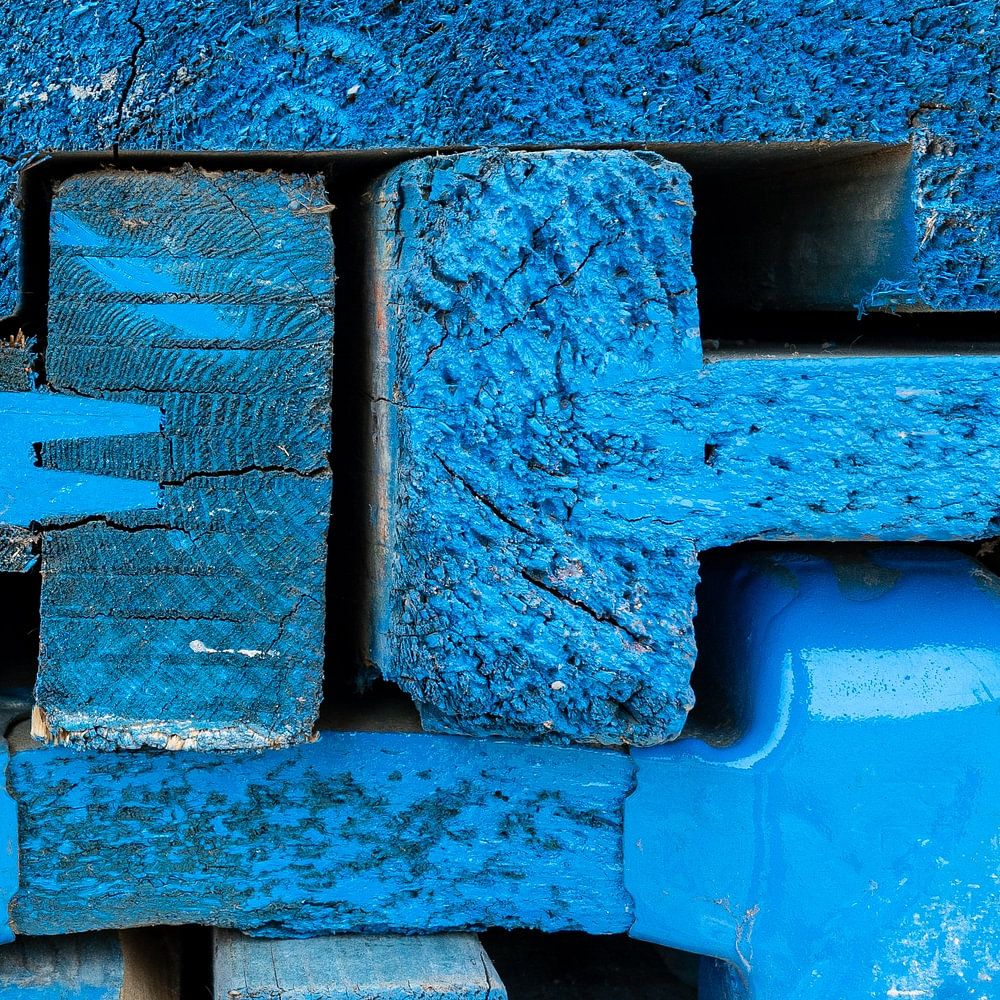 Motifs en bois peint en bleu sur un chantier de construction appartenant au ministère des travaux publics et à l'entreprise combinée Alséén. Les attributs en bois astucieusement empilés sont utilisés dans le cadre des travaux d'amélioration de l'infrastructure de circulation de l'échangeur autoroutier Hooipolder, près de Raamsdonksveer. C'est là que se croisent les autoroutes A27 et A59.