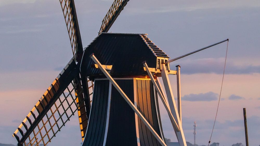 Le soleil levant brille sur ce moulin avec du brouillard en arrière-plan.