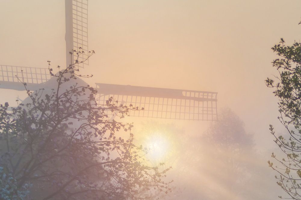 Moulin photographié dans le brouillard au lever du soleil.