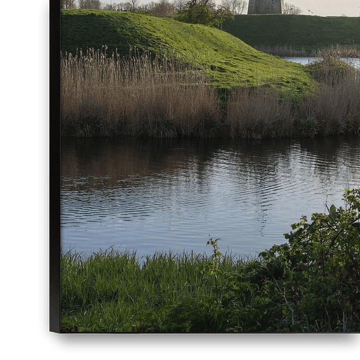 Un moment de calme dans la lumière du matin près du moulin de Woudrichem. Ce moulin à vent caractéristique se dresse fièrement sur la digue, doucement éclairé par les premiers rayons du soleil. Au premier plan, l'eau calme reflète le ciel clair, tandis que les roseaux et l'herbe d'un vert frais encadrent les berges naturelles. La…