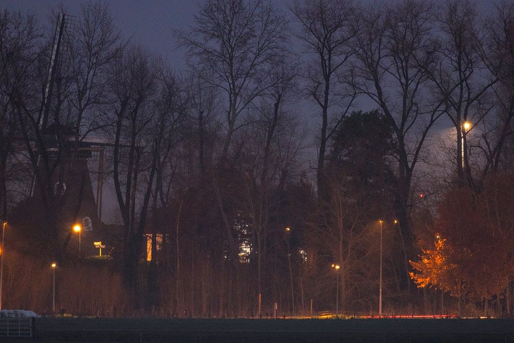 La photo montre la pleine lune qui pend au ras de l'horizon, le soir, au-dessus du moulin de Drunen. Avec un objectif de 400 mm, la lune apparaît en grand sur l'image avec une couleur orange. C'est un spectacle magnifique.