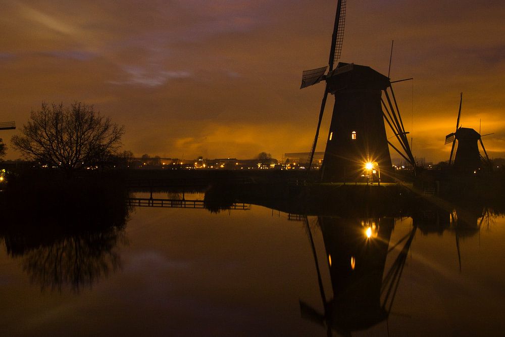 Moulins à vent à Kinderdijk juste après le coucher du soleil