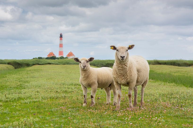 Mouton domestique, Ovis orientalis aries, brebis avec agneau devant le phare de Wetserhever, Schleswig-Holstein, Allemagne