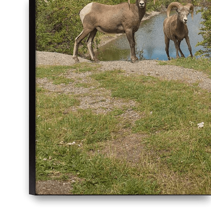 Moutons Berghorn près d'un lac dans les Rocheuses, Alberta, Canada