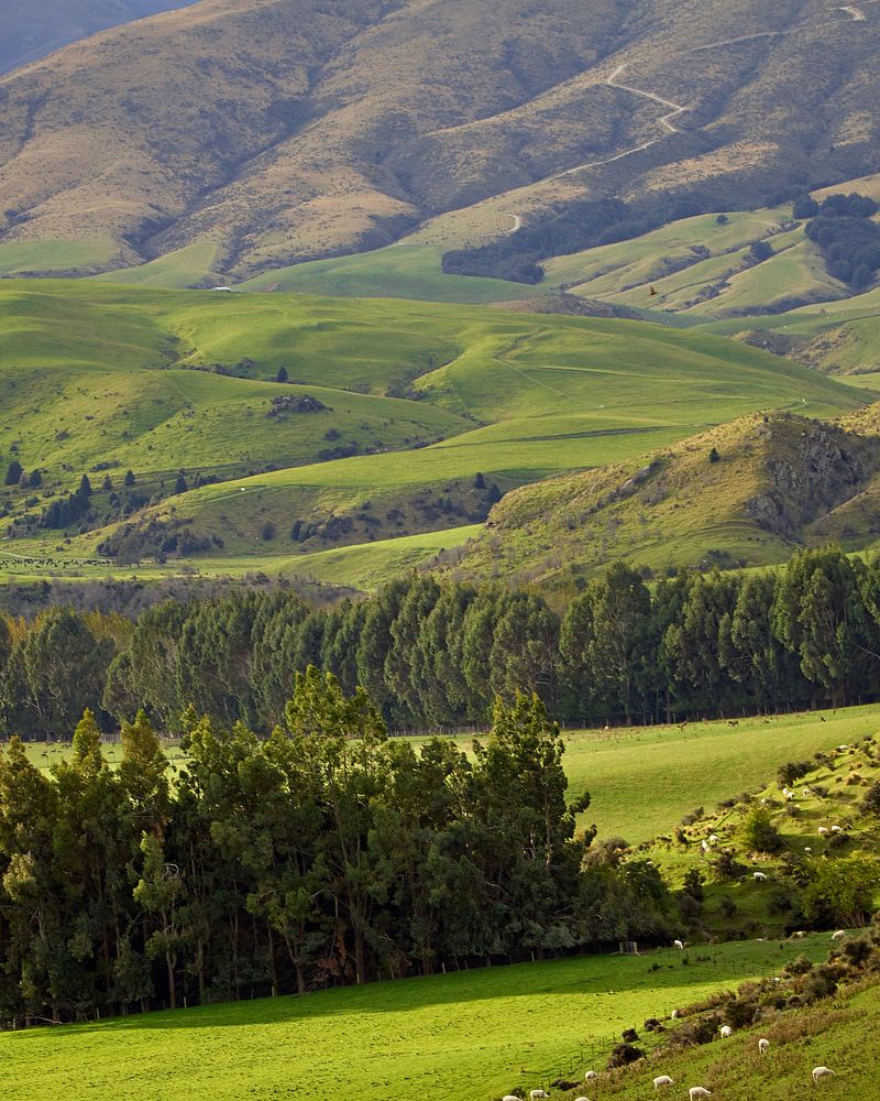 Un troupeau de moutons paît paisiblement sur une colline de l'île du Sud de la Nouvelle-Zélande