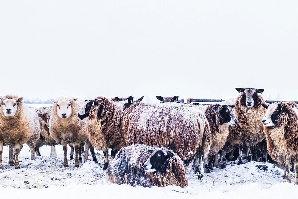Moutons dans une prairie enneigée dans un paysage hivernal lors d'une froide matinée d'hiver dans la région d'IJsseldelta à Overijssel, aux Pays-Bas.