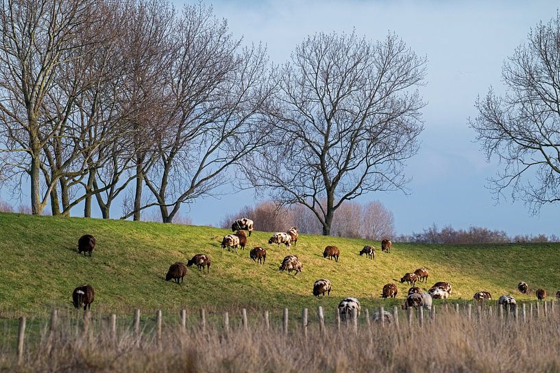 Des moutons gardent l'herbe courte sur un talus de gardons, éclairé par un soleil d'hiver.