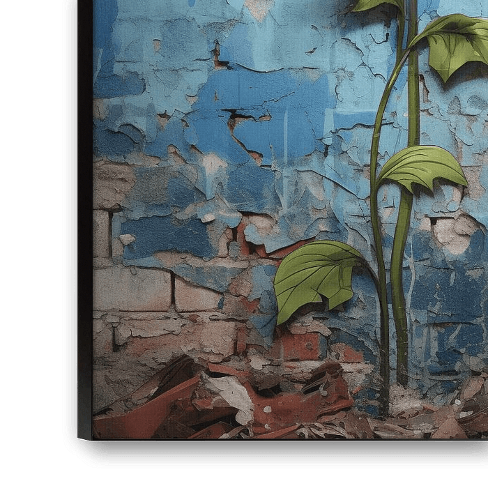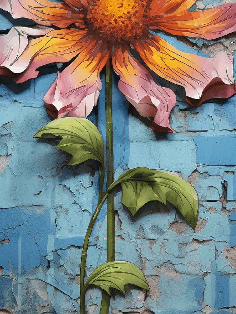 Une fleur de grand format dans des tons délicats de rose et d'orange s'épanouit en tant qu'art mural sur un mur de briques usé et peint en bleu. Des tiges et des feuilles vertes semblent émerger des gravats sous-jacents et relient la fleur peinte au sol. La texture rugueuse du mur qui s'effrite forme un contraste saisissant avec les couleurs douces et les formes organiques de la fleur. L'environnement urbain est animé de manière surprenante par cet élément floral. C'est un signe de beauté et de croissance au milieu de la décadence.