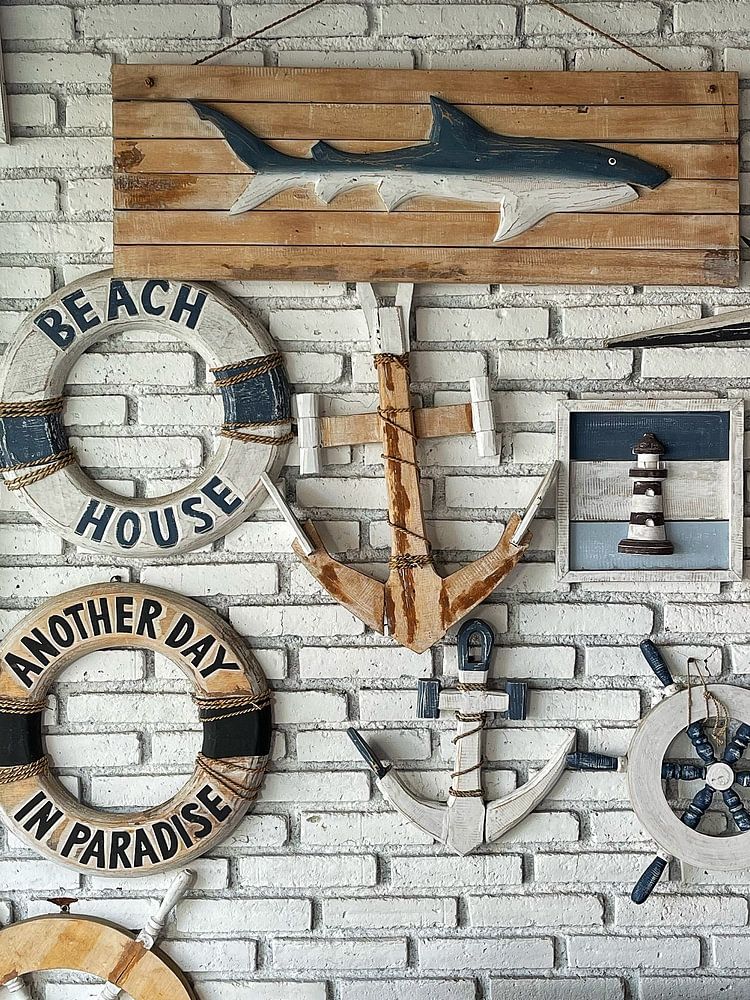 Mur rempli de divers symboles nautiques.
