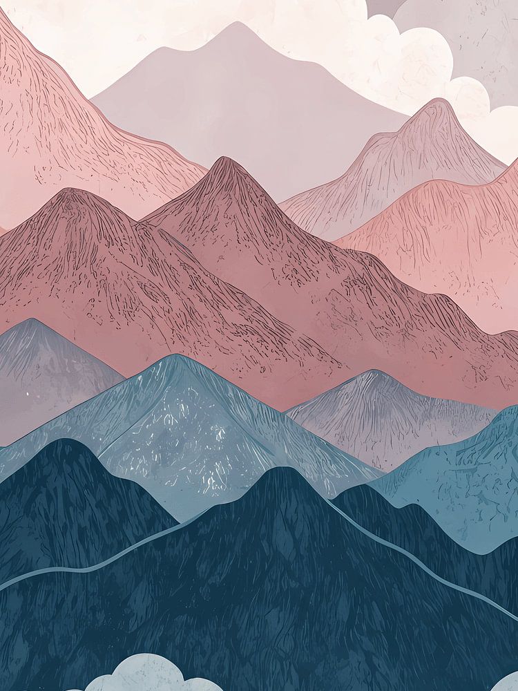 Cette œuvre d'art numérique sereine capture un paysage tranquille où des montagnes majestueuses et stratifiées dans des tons de rose, de lavande et d'indigo profond rencontrent un océan dynamique et stylisé. De douces vagues aux crêtes écumeuses roulent vers le premier plan, contrastant avec le ciel immobile, parsemé de nuages, où un soleil ou une lune douce, aux teintes fardées, plane paisiblement. L'utilisation par l'artiste de la texture et de la couleur crée une atmosphère onirique, invitant à la contemplation et au calme.