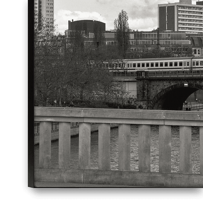 Ce paysage urbain a été pris avec le Nikon D90. Le sujet montre le musée Bode sur l'île des musées sur la Spree à Berlin-Est. Depuis le pont Monbijou, on a une vue fantastique directement sur le train de banlieue et la tour de télévision. La réduction des tons de couleur au noir et blanc classique confère au motif de l'image une atmosphère élégante, graphique et intemporelle. Il s'intègre ainsi parfaitement dans tous les espaces de vie et de travail.