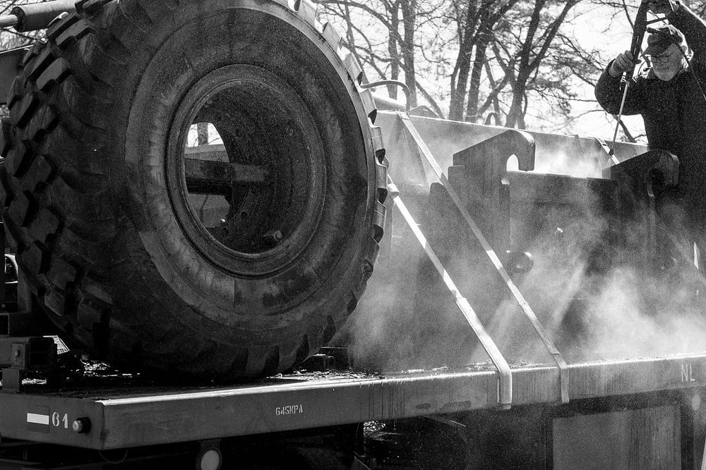 Ici, un bénévole est en train de remettre en état un vieux véhicule à l'aide d'un pulvérisateur à haute pression.