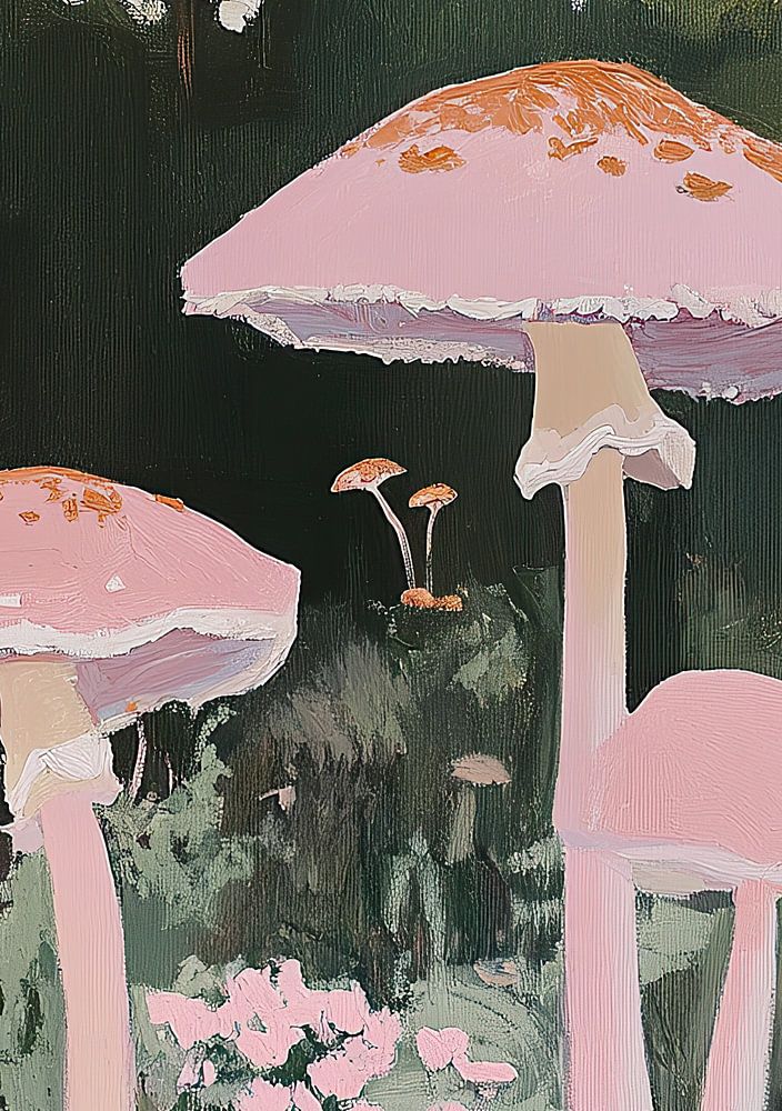 Peinture à l'huile vintage de champignons roses dans la forêt, avec une esthétique de maison de campagne. Les couleurs sont des pastels atténués, avec des nuances de rose et de vert. La photo est prise d'un angle bas, avec des fleurs qui poussent autour des champignons. Les coups de pinceau sont simples et minimalistes, créant une esthétique vintage avec une palette de couleurs neutres.
