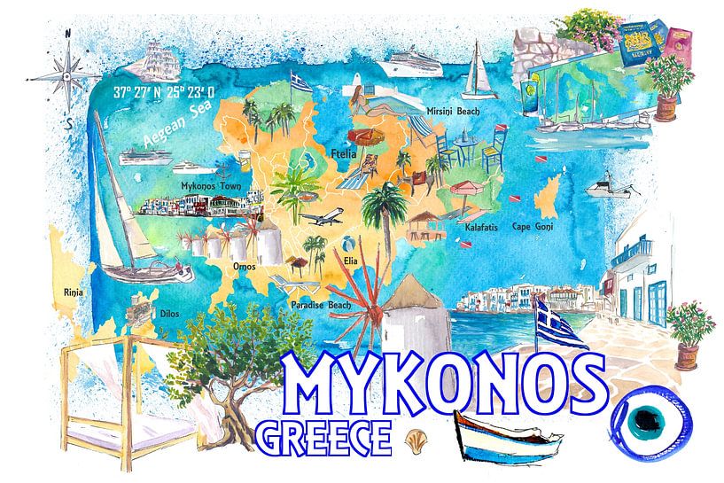 À propos de ‘Mykonos Grèce Cyclades Carte illustrée de l'île avec les sites célèbres’ par Markus Bleichner