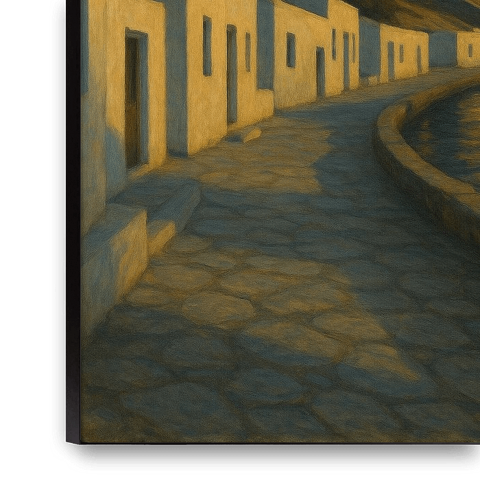 Mykonos in Fading Light capture les emblématiques moulins à vent de l'île le long de la courbe tranquille du rivage de la mer Égée. Le soleil se couche sur les façades blanches et la passerelle en pierre, qui s'illuminent d'une dernière lueur. L'artiste, inspiré par la solitude lyrique de Hopper, transforme un point de repère familier…