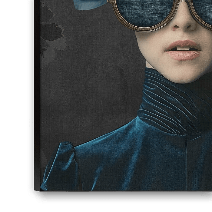 La femme porte une robe de velours bleu foncé qui évoque l'élégance et un certain mystère. Son visage est calme et impénétrable, avec un teint pâle qui contraste avec les couleurs sombres qui l'entourent. Ses grandes lunettes de soleil cachent ses yeux, ajoutant un sentiment d'anonymat et de mystère à son personnage.
