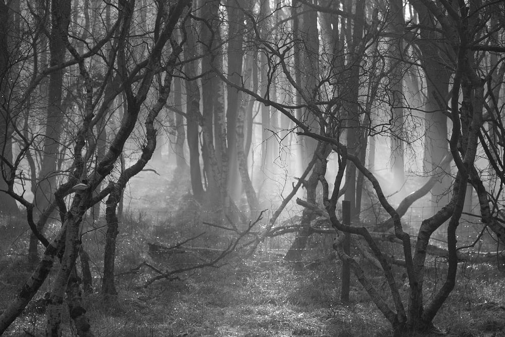 Promenade dans les Kennemerduinen à la veille du Nouvel An 2020. La lumière traverse l'ombre des arbres. Une image effrayante qui évoque toutes sortes de mystères.