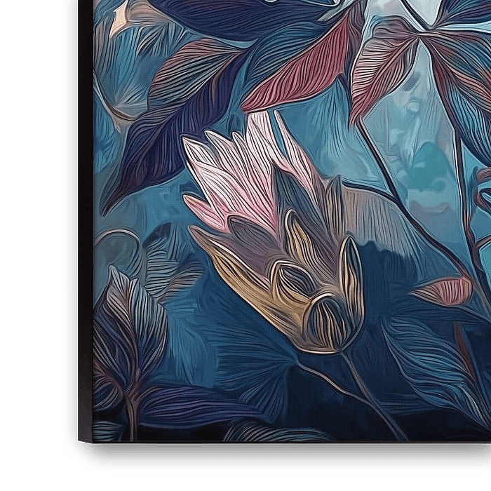 Een betoverend digitaal kunstwerk waarin majestueuze passiebloemen in levendige blauwtinten en zachte pastels zich verheffen boven een mistig berglandschap. De dramatische compositie combineert botanische precisie met een dromerige sfeer, waarbij de bloemen als hemelse wachters over de bergen lijken te zweven tegen een romantische achtergrond van roze en turquoise wolken.