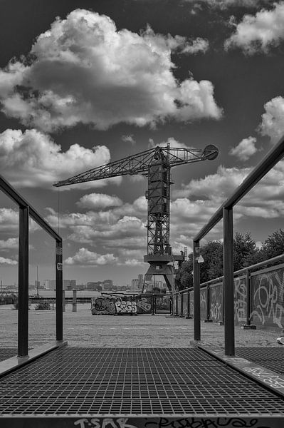 L'ancien terrain de NDSM à Amsterdam Noord avec sa grue caractéristique, ses graffitis et ses vieux trams. En arrière-plan, vous pouvez voir le centre-ville d'Amsterdam.