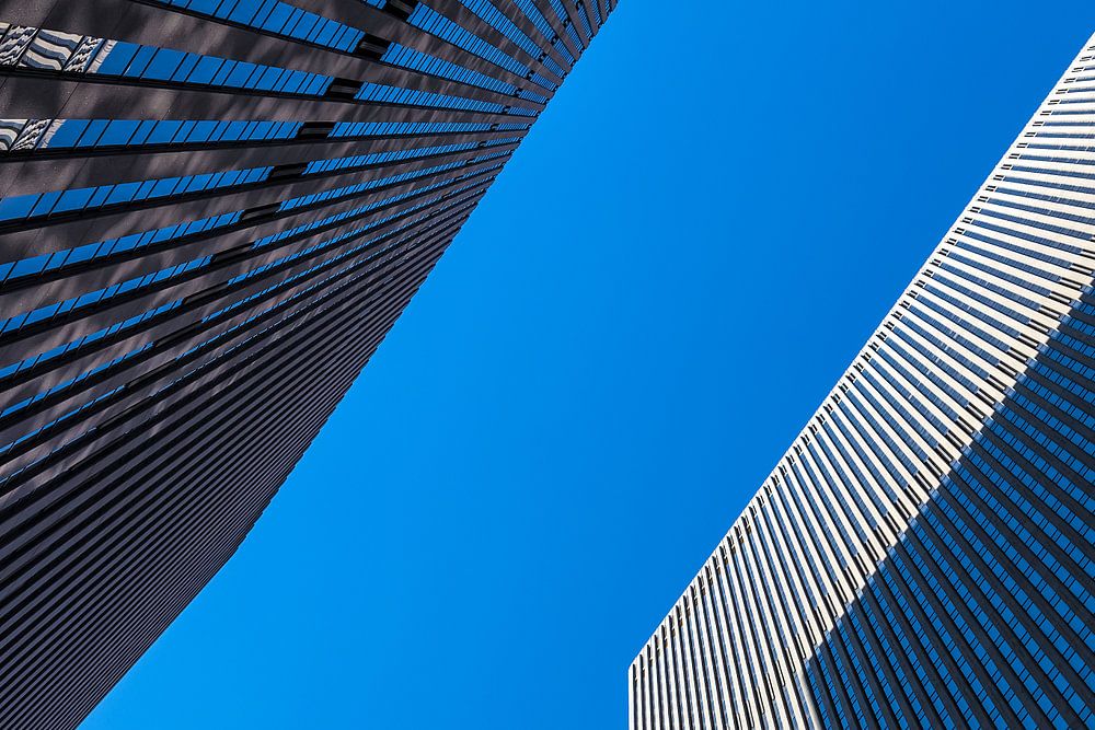 Upward view of two skyscrapers in New York City. One skyscraper casts a shadow on the other one.