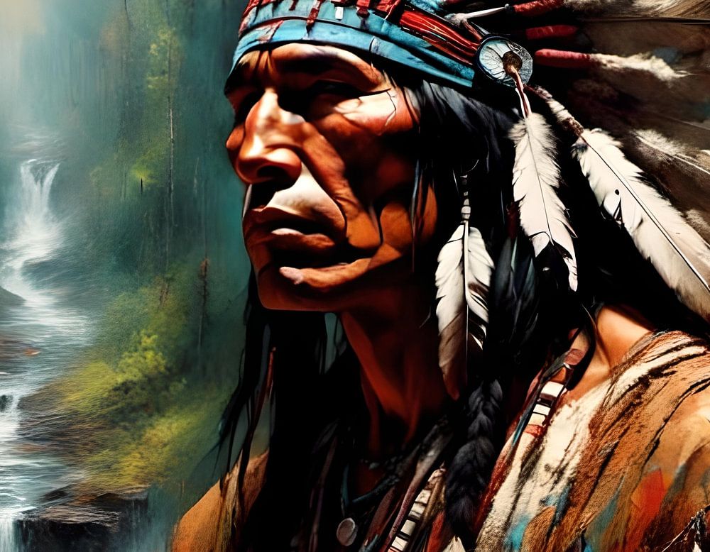 Le portrait de profil d'un Amérindien est mis en évidence sur un fond brumeux et boisé avec une chute d'eau. Il est paré d'une coiffe traditionnelle en plumes et son expression est pensive et calme.