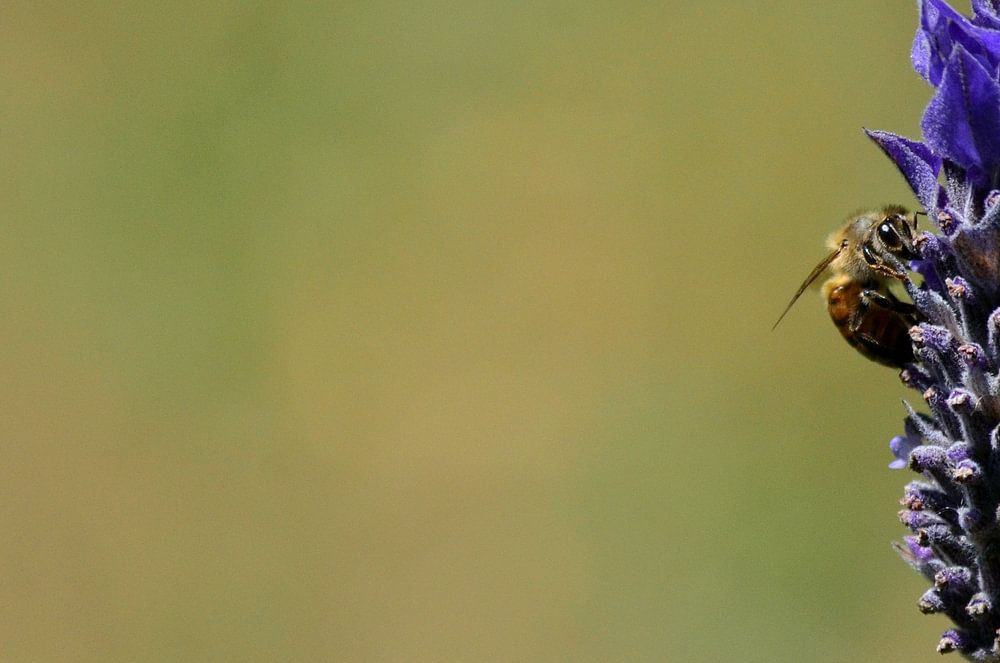 Lavande et abeille. Une photographie simple, caractérisée par son minimalisme, avec une fleur de lavande et une petite abeille, tout en créant une composition naturelle moderne.