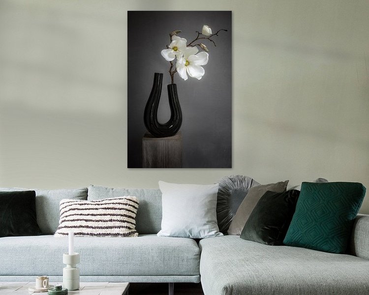 Une fleur blanche dans un vase noir de forme différente est toujours bonne et s'intègre bien dans tout intérieur moderne. L'orchidée en soie reste belle même après plusieurs années.
