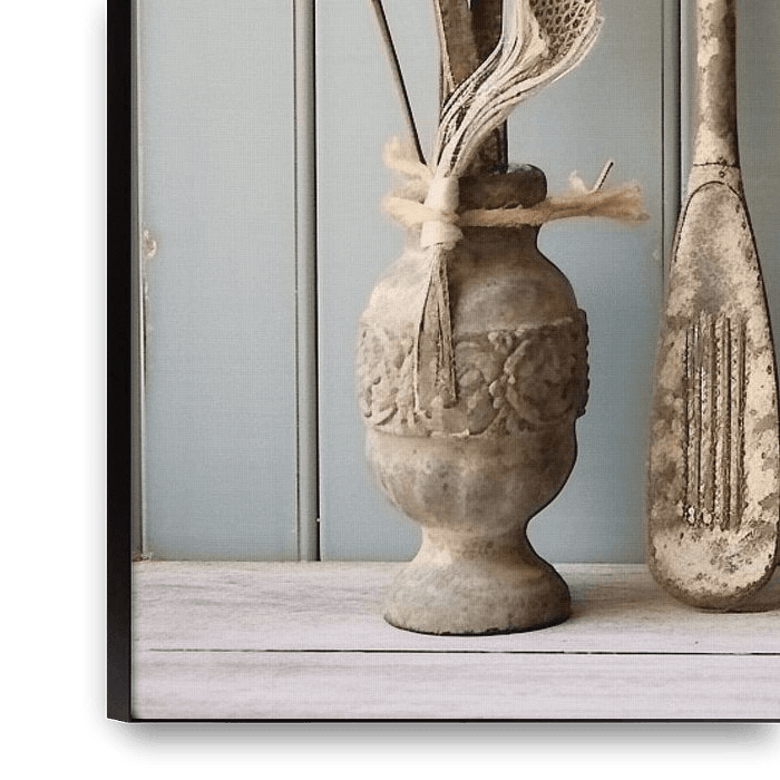 Cette nature morte présente une charmante collection d'ustensiles de cuisine vintage et de vases de style shabby chic, disposés devant un lambris en bois bleu pastel. Quatre grandes cuillères et spatules en métal rouillé sont posées à la verticale dans des vases en pierre ou en céramique vieillis et artistiquement décorés. Des ficelles…