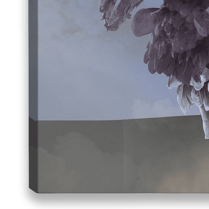 Nature morte, inspirée par la tempête Eunice, collage photo horizontal d'un grand pot Villeroy et Boch contenant des pivoines et des tulipes sur un fond sombre qui semblent être emportées dans un tourbillon. Le tout sur fond de ciel nuageux.
