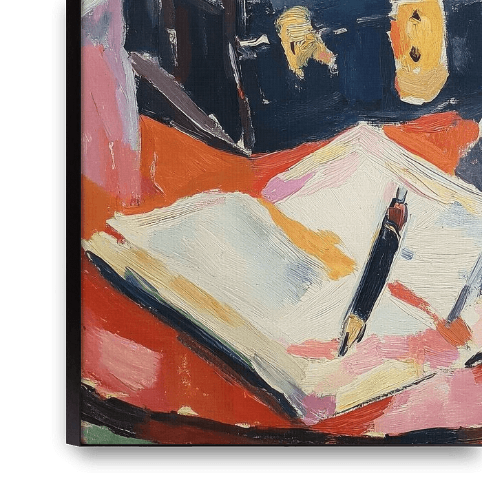 Une nature morte impressionniste montre un attaché-case noir sur une table ronde rouge-orange. A côté se trouve un carnet de notes ouvert avec un stylo noir, à droite une tasse de café blanche avec un contenu orange sur une soucoupe. La surface de la table est décorée dans des tons orange et rose avec des coups de pinceau visibles. Le…