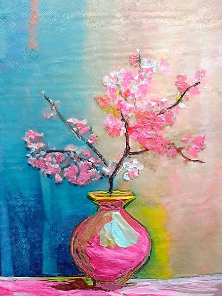 Une nature morte moderne d'un vase avec une branche de cerisier en fleur avec une combinaison de couleurs fraîches dans des couleurs pastel vives.