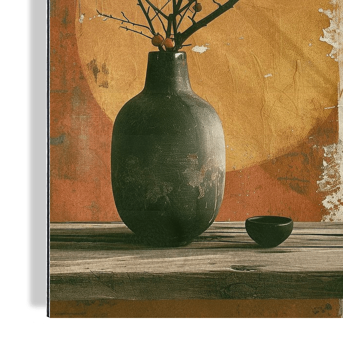 Dans ce tableau, nous assistons à une harmonie magistrale entre la lumière et l'obscurité, la chaleur et la fraîcheur. La nature morte accueille le spectateur avec une splendeur discrète, où un vase est posé sur une table en bois rustique. Le vase est orné d'une branche noire, subtilement constellée de baies, qui se balance doucement dans le souffle de la pièce. À côté du vase se trouve un modeste bol noir, témoin silencieux de la simplicité quotidienne.