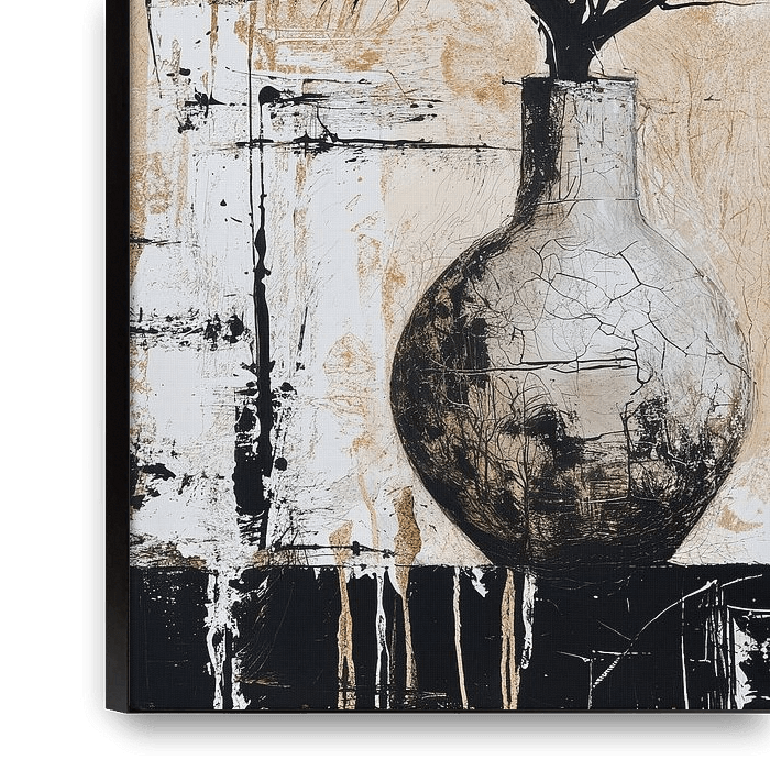 Détails : vase, arbre, cercle, branches, rouge, noir, blanc, beige, abstrait, moderne