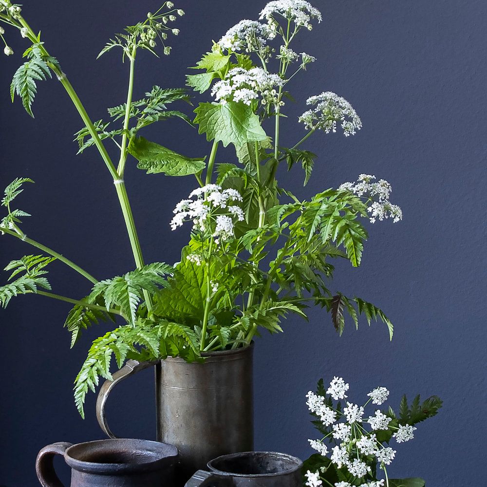 Nature morte avec la simplicité du persil de vache sur un plat en étain en version carrée. Cette photographie est également disponible en format portrait et paysage.