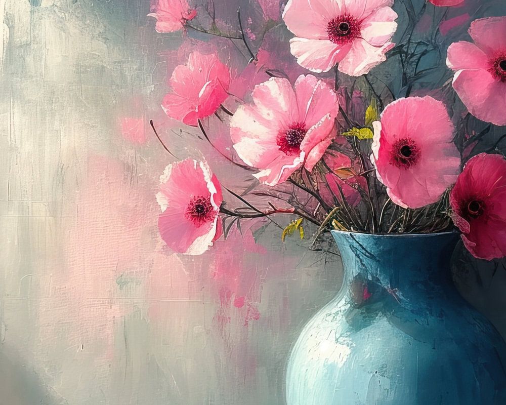 Détails : nature morte, fleurs, vase, contemporain, moderne, peinture, rose, bleu, gris, toile