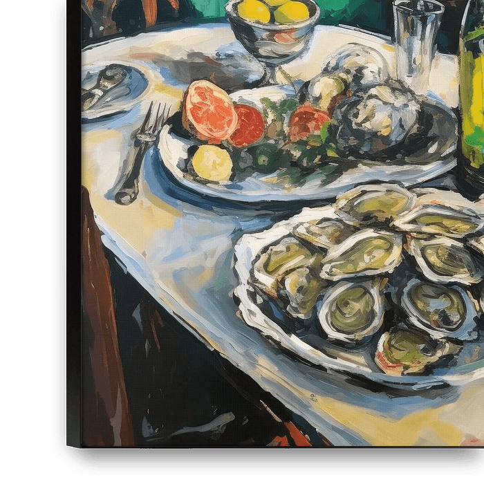 Une table dressée avec des huîtres et du vin. La table est richement dressée dans un salon moderne et classique.