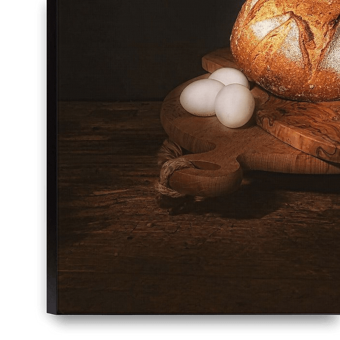 Avec cette nature morte, j'ai capturé la beauté des choses simples, avec une lumière qui rappelle celle des vieux maîtres. La lumière chaude apporte de la chaleur dans votre pièce et l'atmosphère du pain fraîchement cuit. Joli pour son format carré . aussi joli comme fond d'écran . Facile à installer.