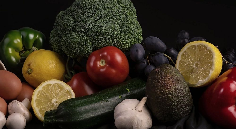 Une nature morte avec de nombreux légumes et fruits (dont des œufs, des champignons, des tomates, des citrons, des poivrons, des raisins) sur un banc en bois avec une nappe noire et deux petites souris au-dessus.