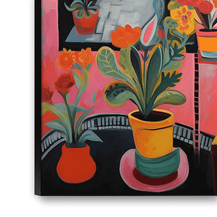 Une peinture d'un magnifique intérieur mexicain chaotique, parsemé de plantes et de fleurs. De l'art mexicain dans le style de Frida. Chaleureux, confortable et accueillant. On aimerait bien s'attarder un peu dans le tableau et laisser son âme vagabonder. C'est ce que l'on peut faire maintenant en trouvant un bel endroit pour cela dans sa propre maison et en le regardant de temps en temps.