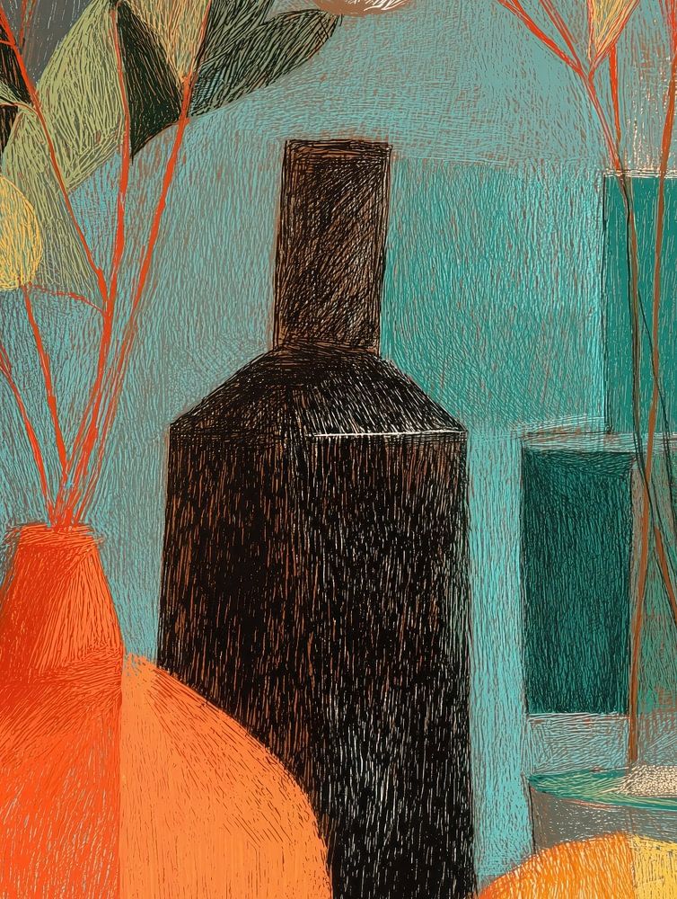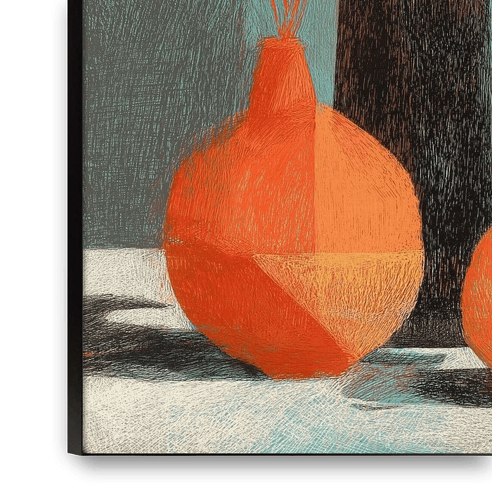 Une nature morte moderne composée de vases stylisés, de fleurs semblables à du coton et de formes d'agrumes chaudes, rendue avec des traits de crayon texturés et une palette de couleurs calmes et sourdes qui équilibrent la douceur et la structure.