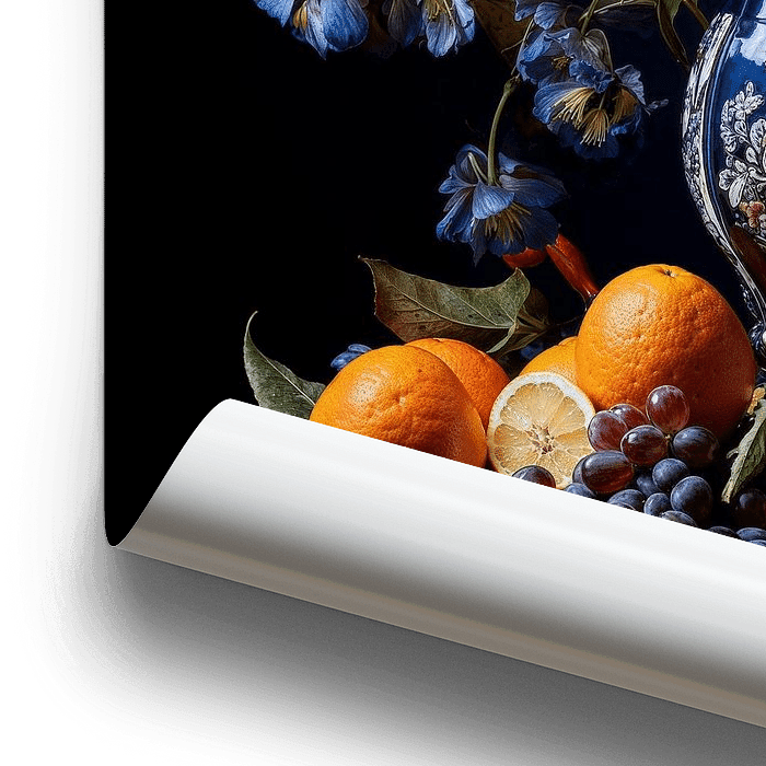 Nature morte avec des fleurs dans un vase, couleurs principales bleu et orange, oranges, raisins, tulipes.