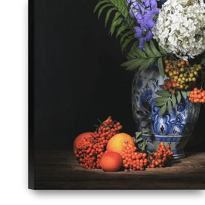 Nature morte intemporelle avec vase bleu de Delft, delphiniums, baies d'orange et fruits. Facile à installer dans la salle e avec un aspect riche.