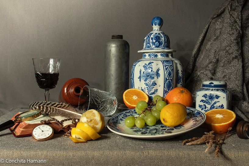 Nature morte avec vase bleu de Delft. C'est en piochant dans l'armoire de grand-mère que cette belle image typiquement hollandaise a vu le jour. Les fruits sont presque touchables et la montre à gousset de grand-père indique le caractère éphémère du temps.
