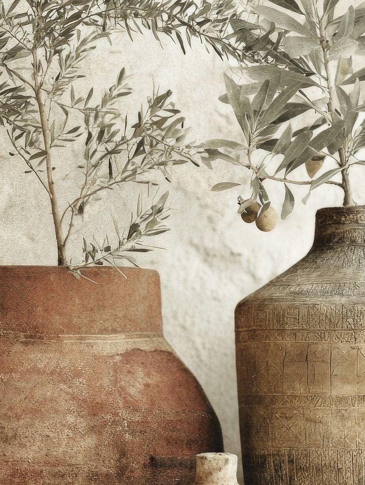 Une composition méditerranéenne sereine avec des poteries et des branches d'olivier, exécutée dans des tons de sable doux et de terre cuite chaude. Trois jarres de caractère se combinent pour former une nature morte feutrée qui respire la tranquillité et la simplicité. La texture mate de la céramique, l'altération subtile et les délicates feuilles gris-vert confèrent à cette œuvre une véritable atmosphère wabi-sabi : imparfaite, pure et intemporelle.