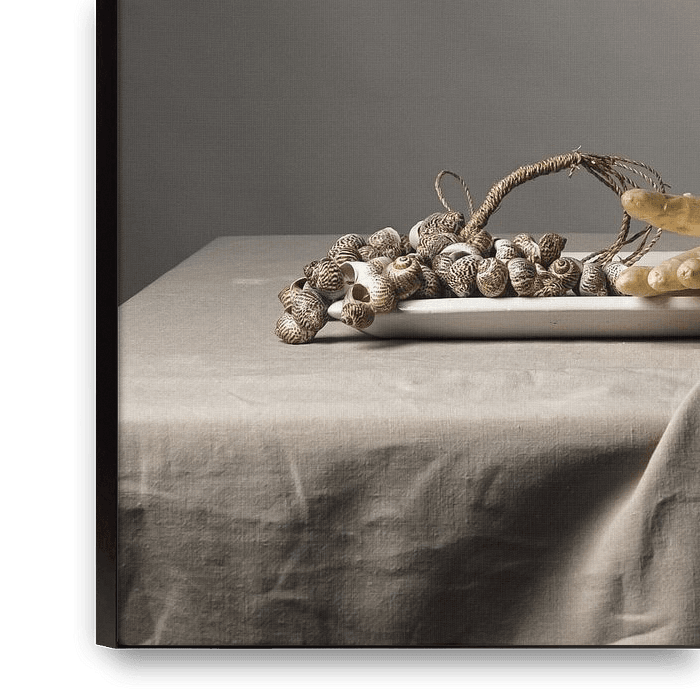 À propos de ‘Nature morte moderne avec asperges, coquillages et verrerie [carré].’ par Affect Fotografie