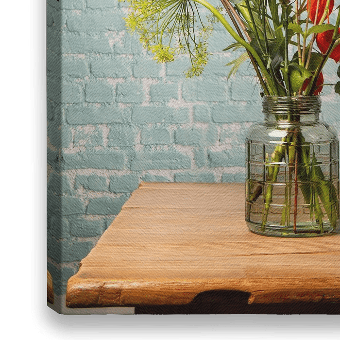 Nature morte d'un bouquet de champ moderne et coloré. Le fond est en briques crues, la table en bois patiné par les intempéries.