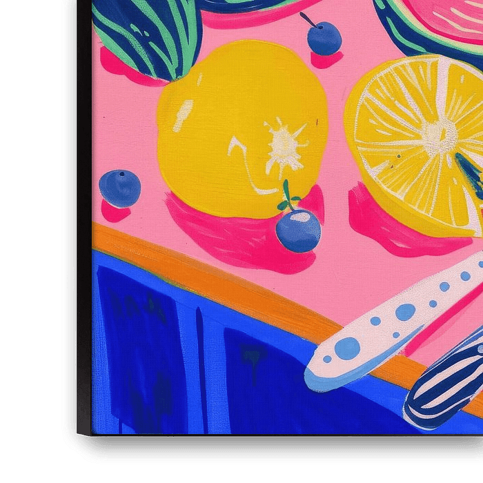 Nature morte moderne et colorée d'une table avec des fruits. Choisissez votre taille et votre matériau pour cette œuvre et faites-en un véritable accroche-regard avec une touche estivale !