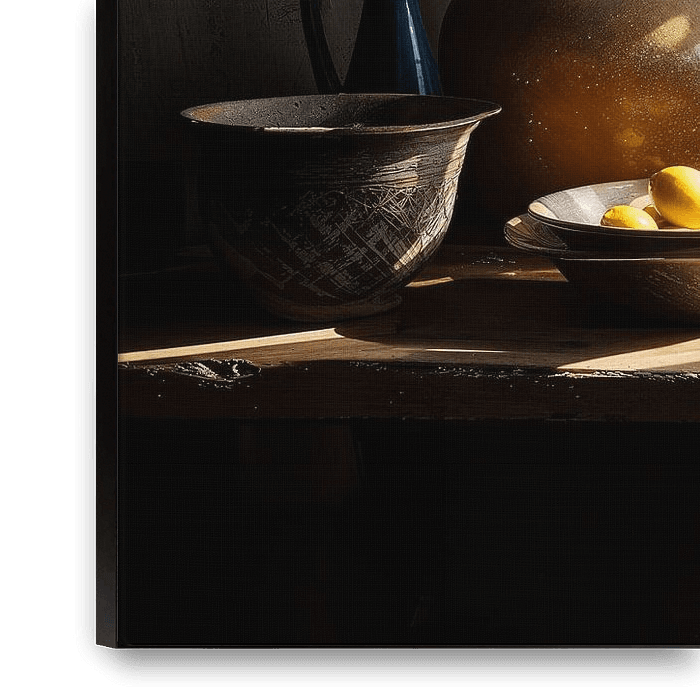 Nature morte intitulée "Zen". Cette nature morte, inspirée d'œuvres de maîtres anciens, présente un aspect serein et une palette de couleurs particulièrement calme, qui évoque immédiatement un sentiment de "zen". La lumière joue un rôle prépondérant dans cette œuvre. Style de vie : rural, wabi-sabi et Japandi.