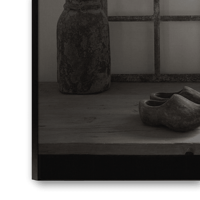 Nature morte rurale avec fenêtre d'écurie, chalets de saules et sabots de bois. L'ensemble est posé sur une vieille table en bois d'échafaudage. Il s'agit d'une nature morte sobre avec une belle lumière douce provenant d'une fenêtre. C'est une image calme avec des tons naturels et grisâtres. En tant que décoration murale, ce tableau s'intègre bien dans un intérieur rural et naturel.