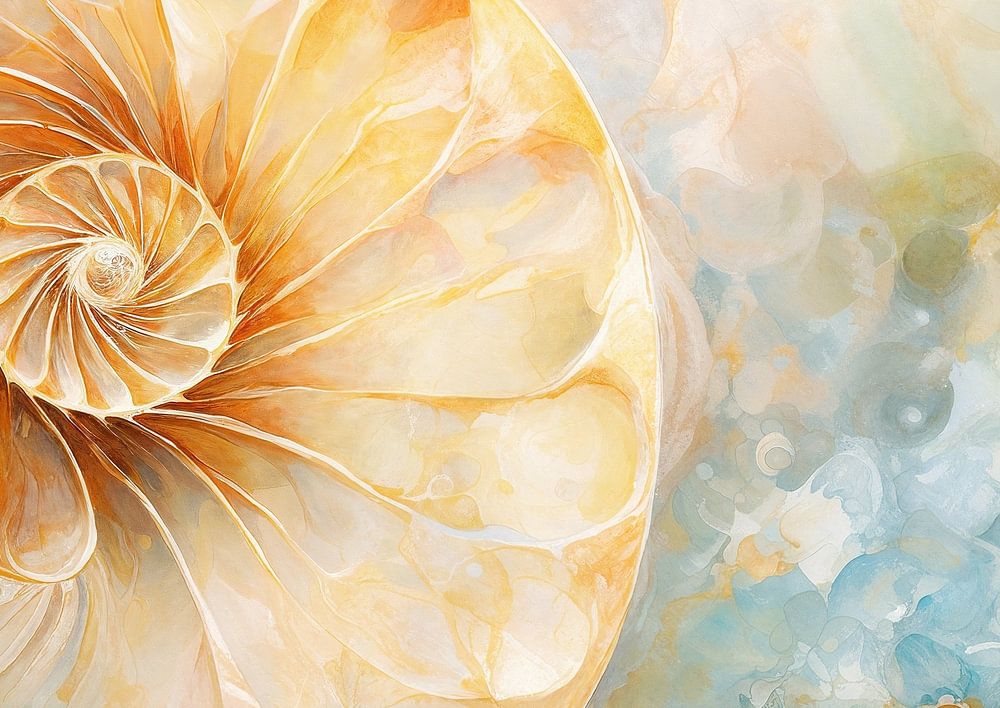 Détails : nautile, coquillage, abstrait, nature, aquarelle, organique, dynamique, chaud, froid, texture, éclat chaud